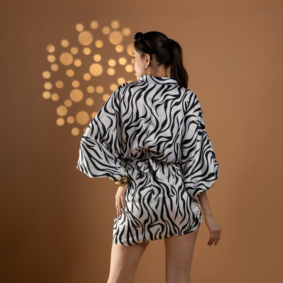 An oversized printed shirt with peasant sleeves matched with a trendy tie-wrap mini skirt, bringing casual elegance with a chic twist.